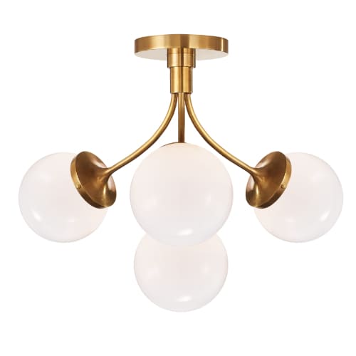 The Prescott semi‑flush mount offers mid‑century inspiration and refined craftsmanship in a ceiling fixture, with softly curved arms in brass and opal glass globes that lend warmth and sophistication to bedrooms, halls or low‑ceiling spaces.